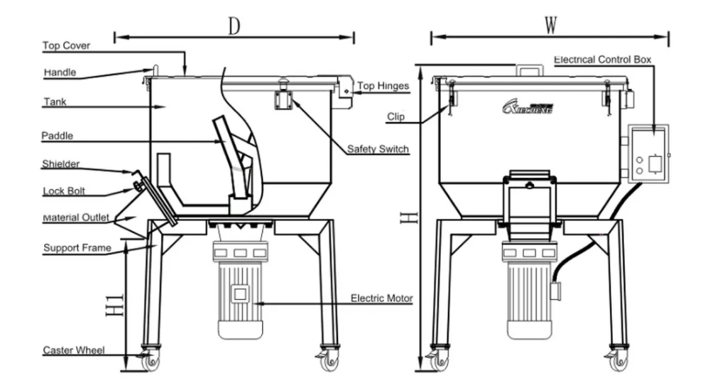 É equipado com motor redutor que oferece baixo ruído, longa durabilidade e zero manutenção. A estrutura compacta com rodas facilita o deslocamento na fábrica, enquanto o timer ajustável entre 0 e 30 minutos oferece controle total sobre o tempo de mistura para sua injetora.
