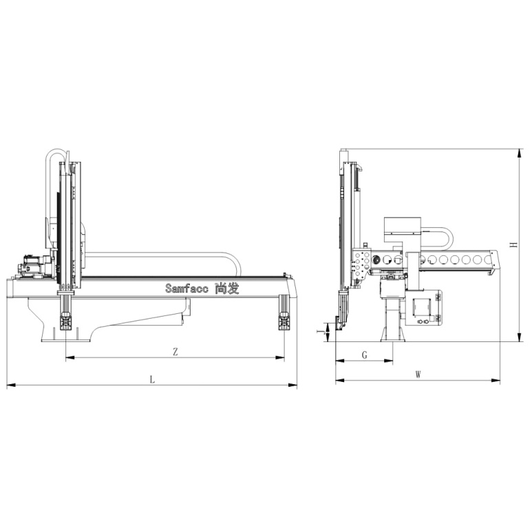 | Modelo | Injetora Aplicável [Ton] | Curso Transversal [mm] | Curso de Extração [mm] | Curso Vertical [mm] | Carga Máxima [kg] | Tempo de Retirada [seg] | Tempo de Ciclo [seg] | Peso do Robô [kg] | L [mm] | W [mm] | H [mm] | Z [mm] | G [mm] | J [mm] |